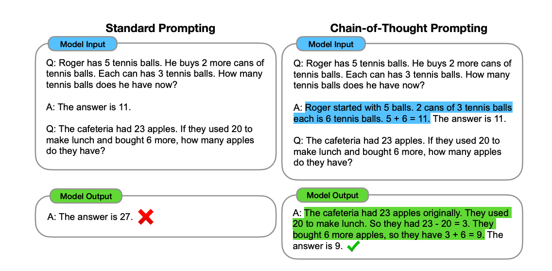 Pour entraîner un modèle à effectuer des CoT, nous lui fournissons des exemples de raisonnement lors de la phase d'entraînement. Le modèle apprend alors à produire des mots intermédiaires qui lui donnent plus d'espace pour effectuer des calculs.